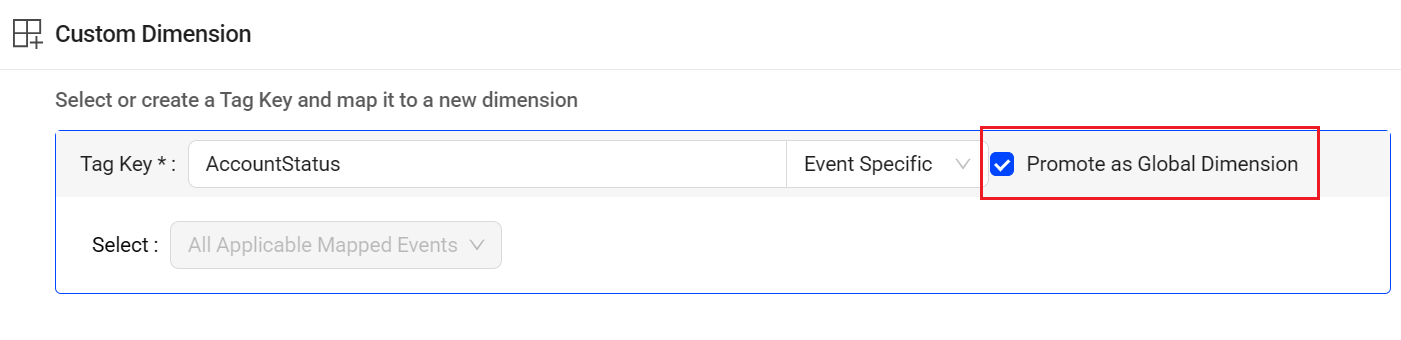 For event-specific tag keys, enable Promote as Global Dimension to treat the tag as a global dimension.
