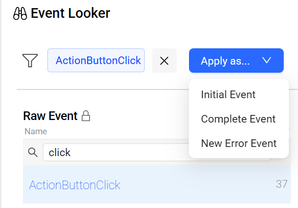 EventLooker: Allows browsing and searching events and tag keys. After rules are selected as filters, click Apply as to apply the event to Initial Event, Complete Event, or Error Event.