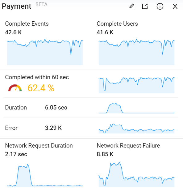 The gauge provides a quick view of the flow’s performance based on the success rate defined in Activation. For example, if the gauge shows 71.2%, it indicates that 71.2% of flows meet the success time boundary defined in Activation among all initiated flows.