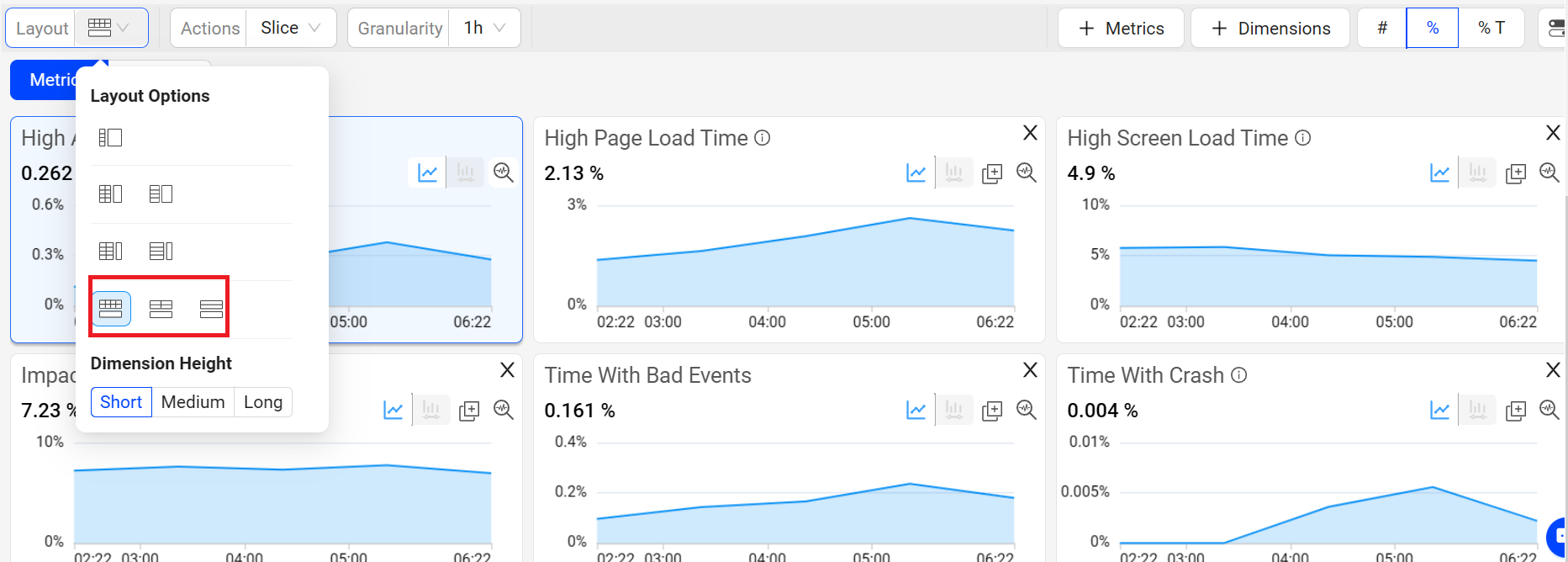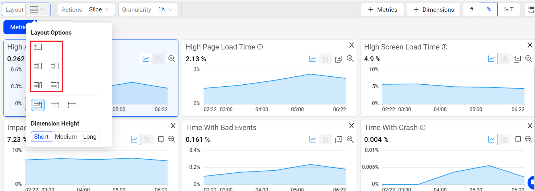 Various metric widget and dimension table sizes, to expand and contract the displayed metric time series and dimension table values