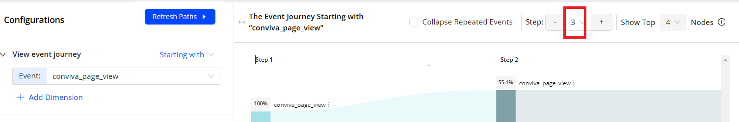 5. Specify the event path step numbers from the right corner of the page. For example, set the step number is 3. As a result, the Paths chart shows 3 steps after the starting point.