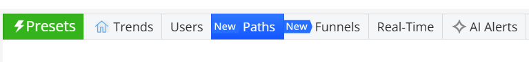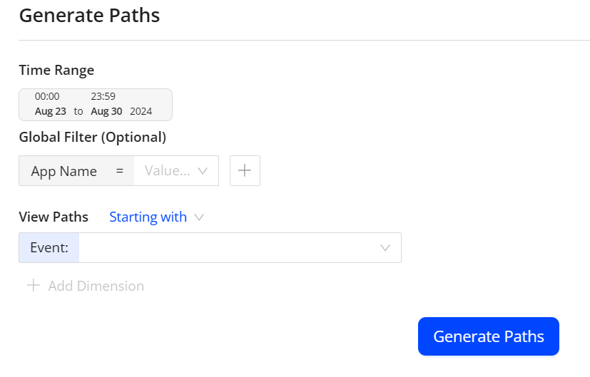 The Paths dashboard enables you to create a Paths chart that visualizes the sequential pattern of user events based on a starting event and subsequent filtered events.