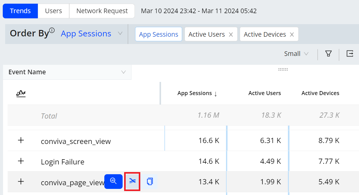 • Hover over an event name from the Event Name list of the Dimensional table on the Trends dashboard, and click the Paths Creation icon.