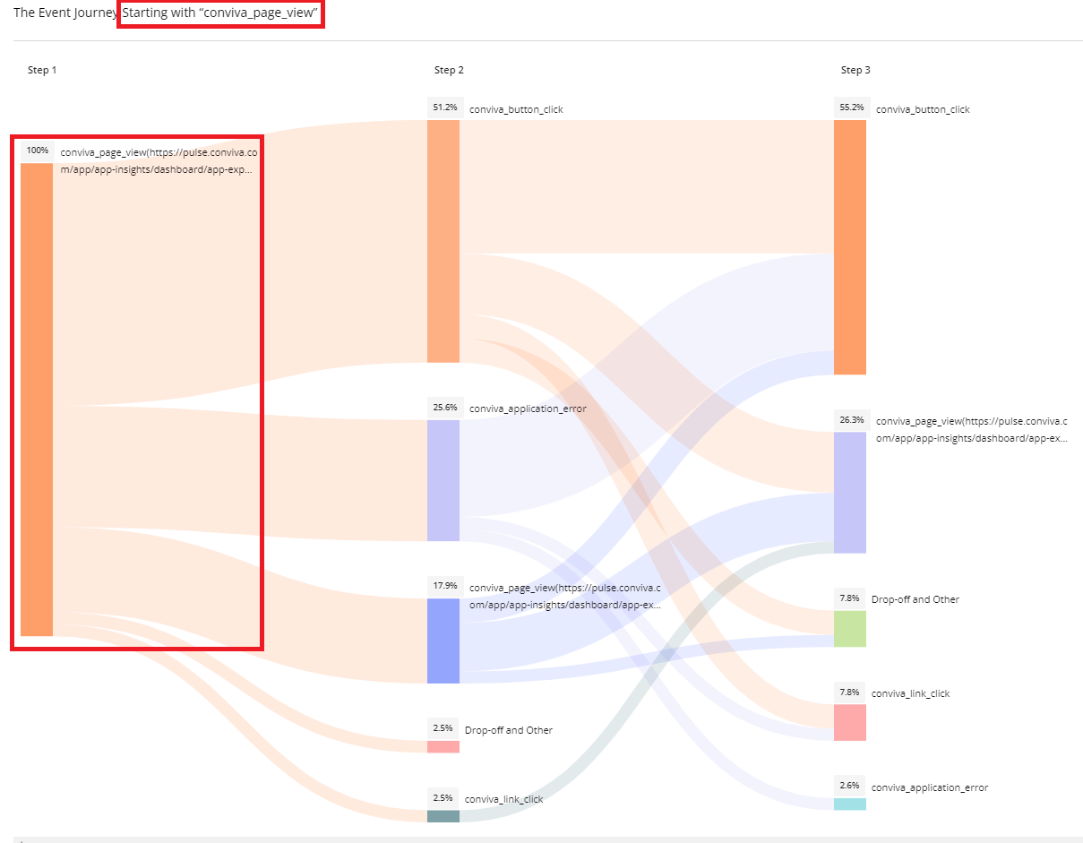 • 1: shows the conversion rate from conviva_page_view to conviva_application_error is 66.28%.