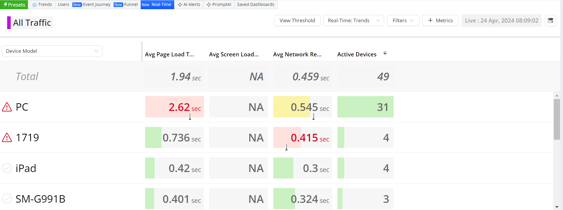 When a threshold is crossed, the impacted metric turns red. Click the metric value to open the Diagnostics page with data for the impacted dimension and filter settings.