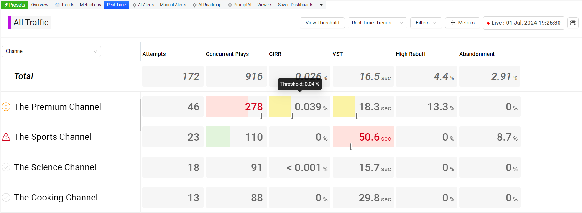 VSI Real-Time dashboard shows the video metrics with color-coded threshold monitoring.