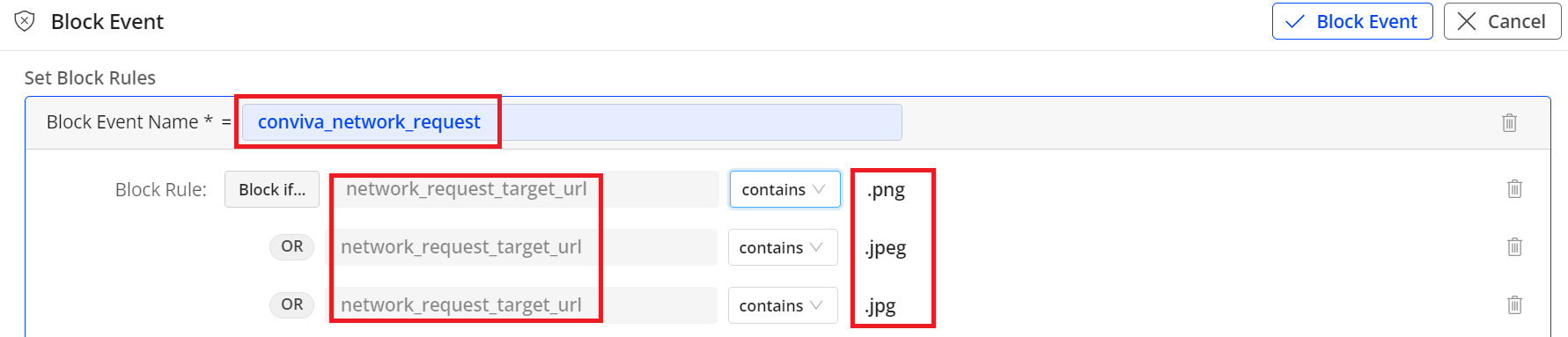 For example, if you want to block the conviva_network_request event that triggered when loading images, select Block if…, and fill out the key values as .png, .jepg, and .jpg.