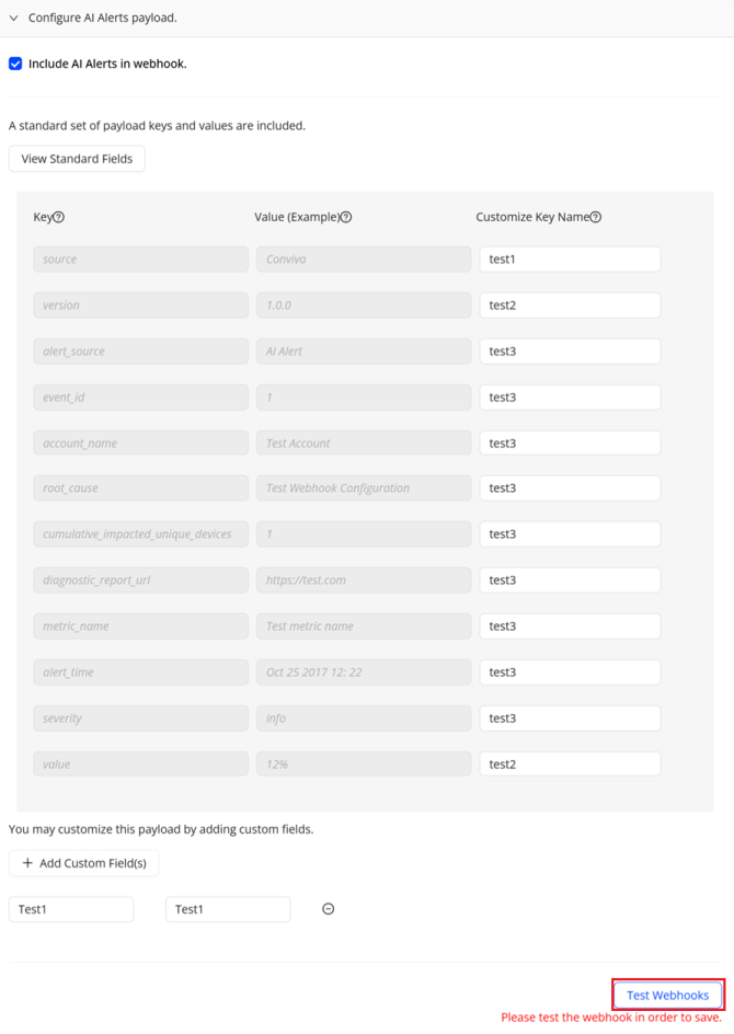 To view the standard AI alert payload key/value pairs, click View Standard Fields. For an explanation of the JSON structure, see Setting Webhook Notifications. If AI alert severity is enabled, the severity level of the alert is passed in the payload.