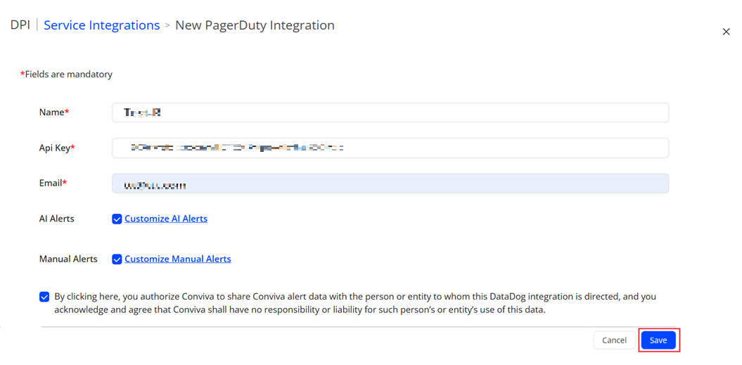 In Conviva DPI, select the Settings > Service Integrations menu and click the PagerDuty to add the PagerDuty services in New PagerDuty Integration page.