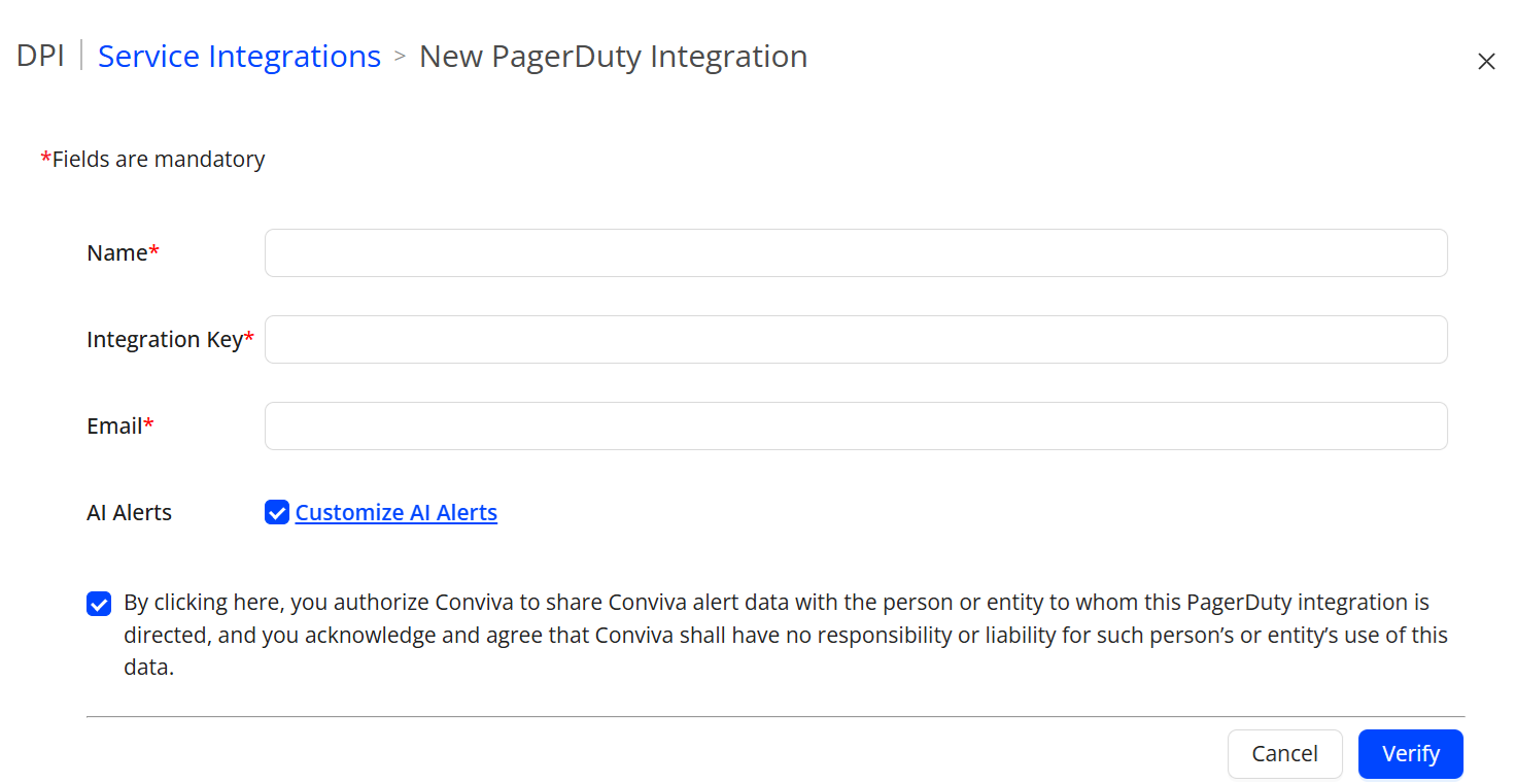 Enter the service fields, including the PagerDuty Service Name and Integration Key and the desired alerts and Click Verify. For more details, see PagerDuty Configuration in Conviva DPI.