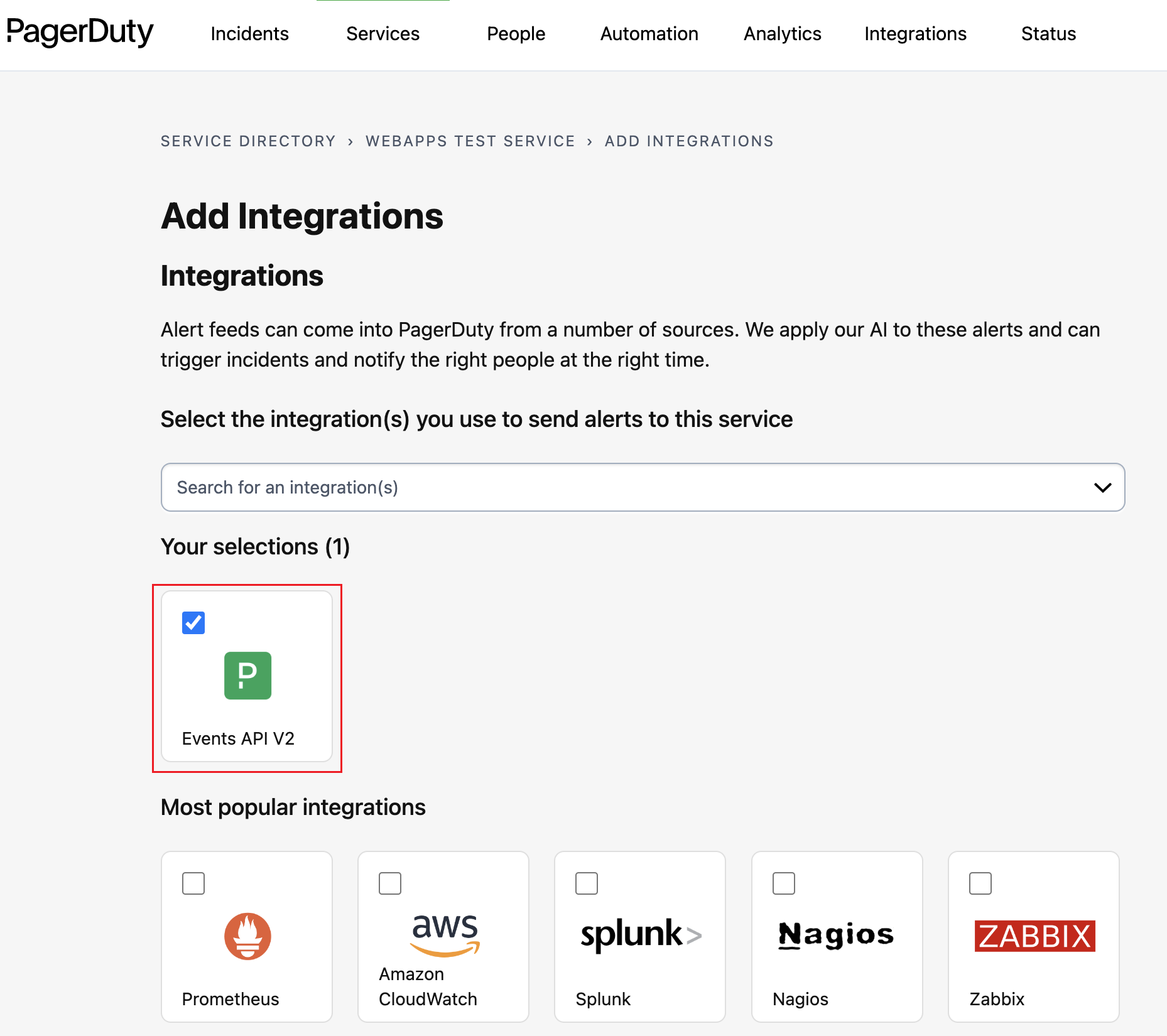On the Add Integrations screen, select Events API V2 from the displayed list of integrations and click Add.