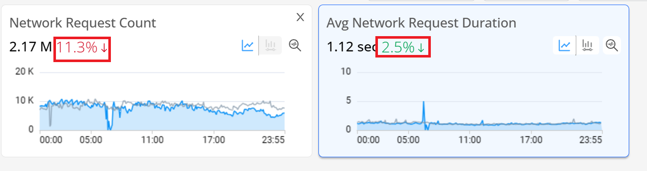 The diagnostics metric widgets are updated with a time line graph representing the previous day (same time-period) for Metric Compare in time-series (highlighted in grey).