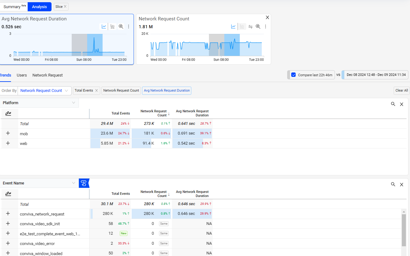 The dimension table refreshes to show the metric Avg Network Request Duration increased across dimensions compared to the last 22h 46m.