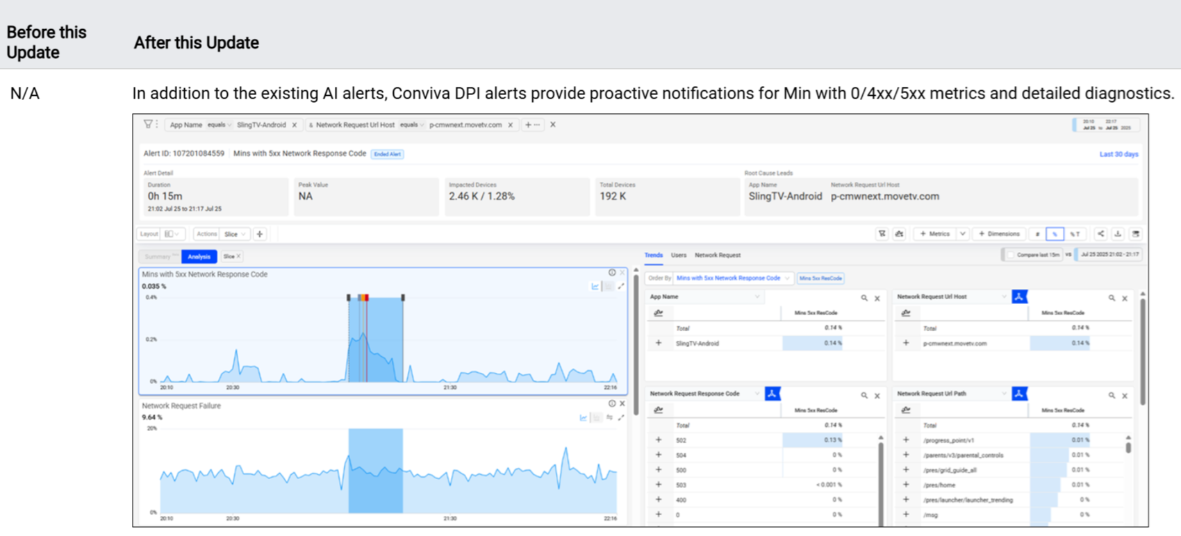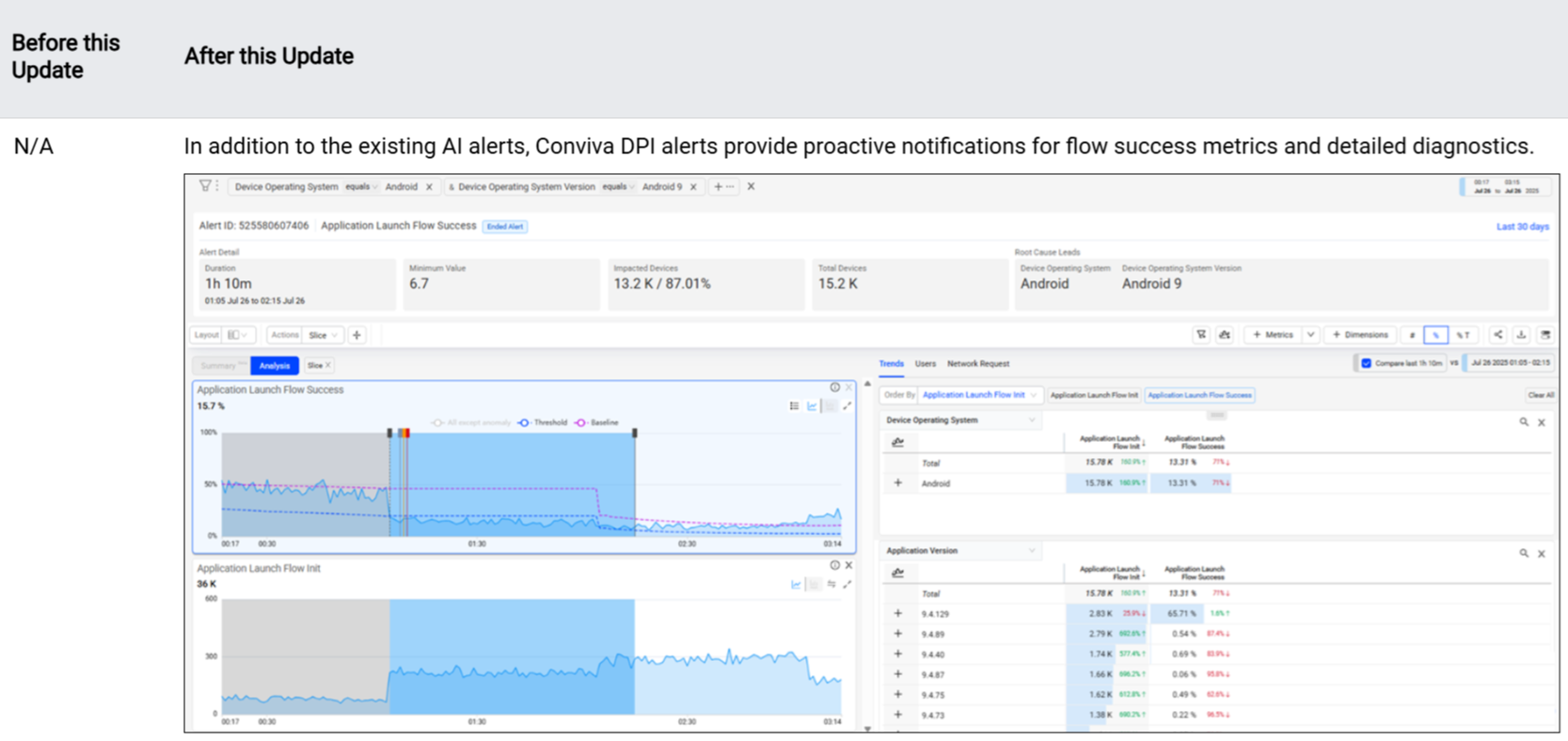 Introduces AI Alerts for Flow Success Rates that trigger when the success rate degrades below the configured success level. These AI alerts provide proactive notifications based on the flow success rate and the configured persistence. Conviva DPI lists each success alert on the AI Alerts page and adds alert indications to the flow time series with links to the AI Alert Diagnostics for detailed analysis and impact insights.