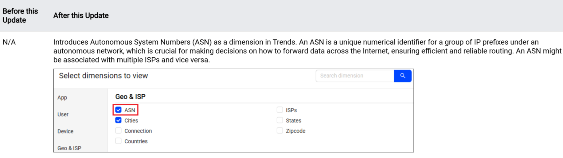 Introduces Autonomous System Numbers (ASN) as a dimension in Trends. An ASN is a unique numerical identifier for a group of IP prefixes under an autonomous network, which is crucial for making decisions on how to forward data across the Internet, ensuring efficient and reliable routing. An ASN might be associated with multiple ISPs and vice versa.