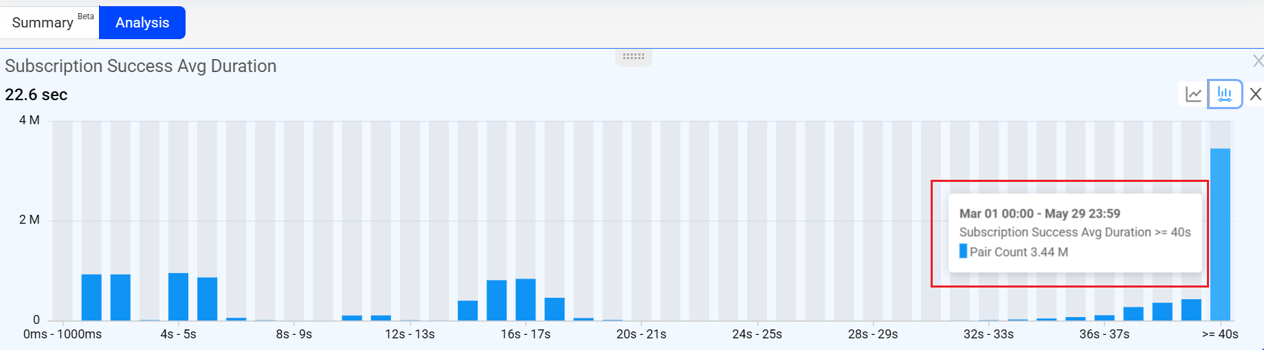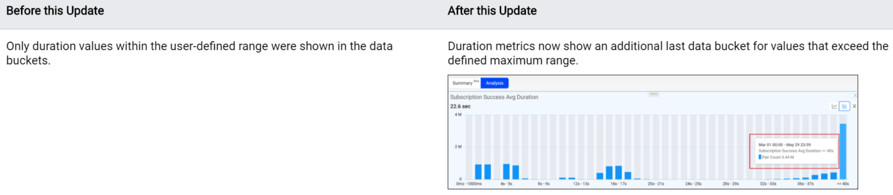Enhances distribution analysis for both Flow Average Duration and custom metrics with a last data bucket for all values greater than the user-defined maximum range. This new data bucket helps display outlier cohorts with unusually long durations and evaluate the coverage of the specified data range.