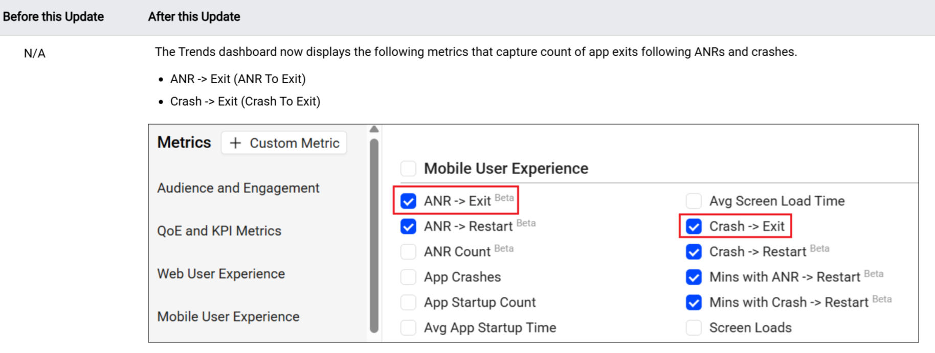Use these new metrics to discover the impacts of app thread processing issues and the causes of app crashes, including data on how often users exit the app after crashes or ANRs.