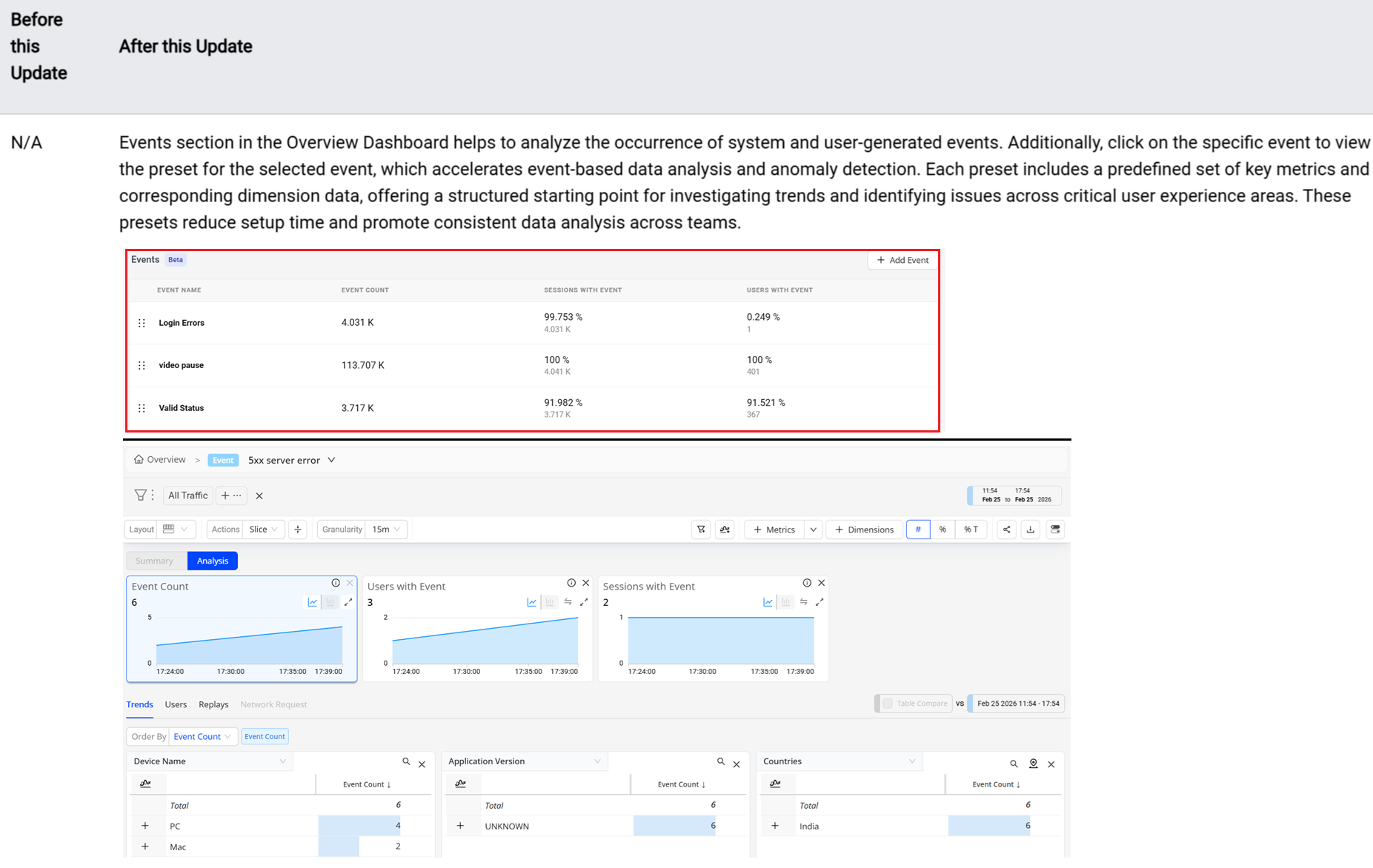 Introduces a new Events section in the Overview Dashboard to analyze the occurrence of various events. Additionally, click on the specific event to view the preset for the selected event, which accelerates event-based data analysis and anomaly detection. Each preset includes a predefined set of key metrics and corresponding dimension data, offering a structured starting point for investigating trends and identifying issues across critical user experience areas. These presets reduce setup time and promote consistent data analysis across teams.