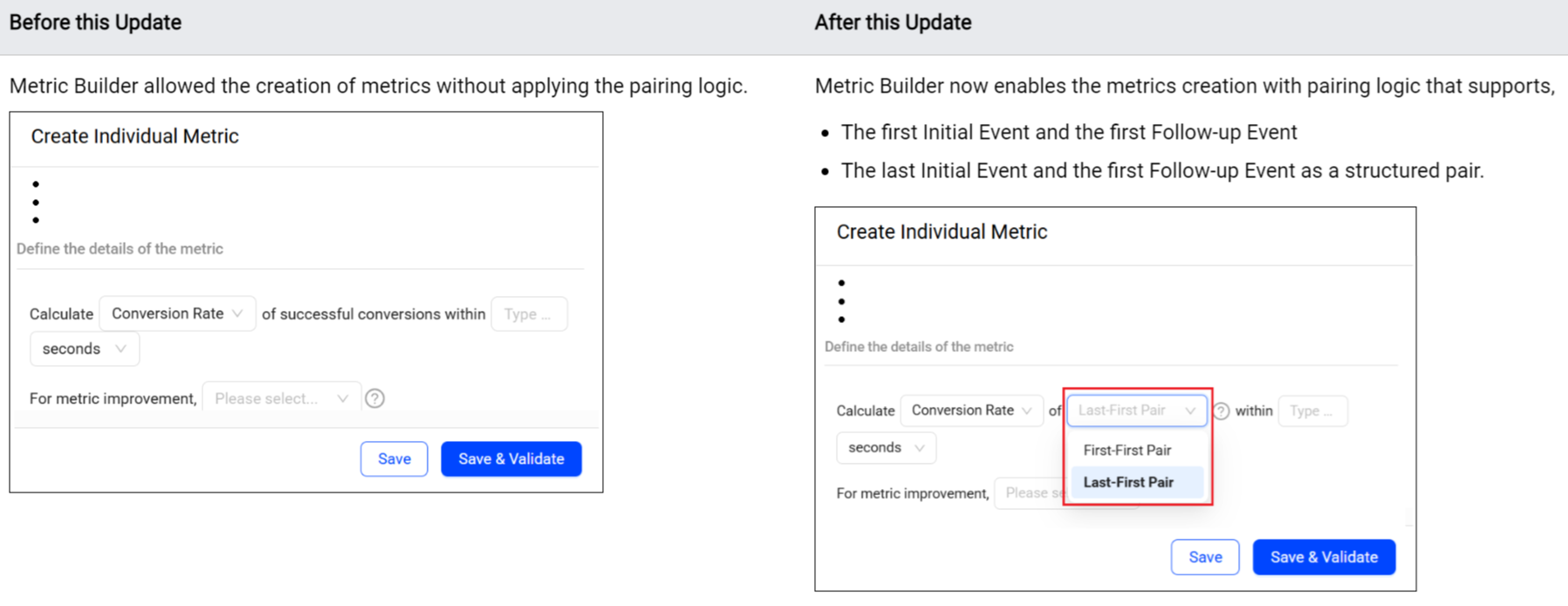 Enables the creation of conversion metrics that count a conversion as successful when the last initial event pairs with the first follow-up event within the specified time frame.