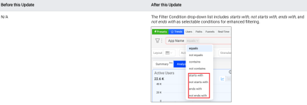 Enables starts with, not starts with, ends with, and not ends with as filter conditions, enabling more options for data filtering.