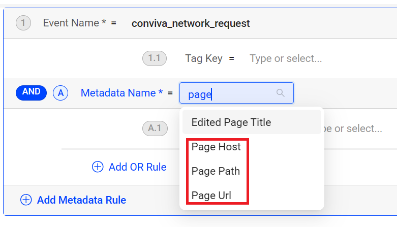 With this enhancement, create more precise page-based mapping rules for event mapping. For example, select conviva_page_view from the Event Name category, choose Page Host from the Metadata Name list, and select app.example.nl as the Metadata Value to build metrics based on this host page. This feature allows mapping of events based on conviva_page_view and originate from a specific page host, enabling more accurate tracking and analysis of user interactions tied to specific page experiences.