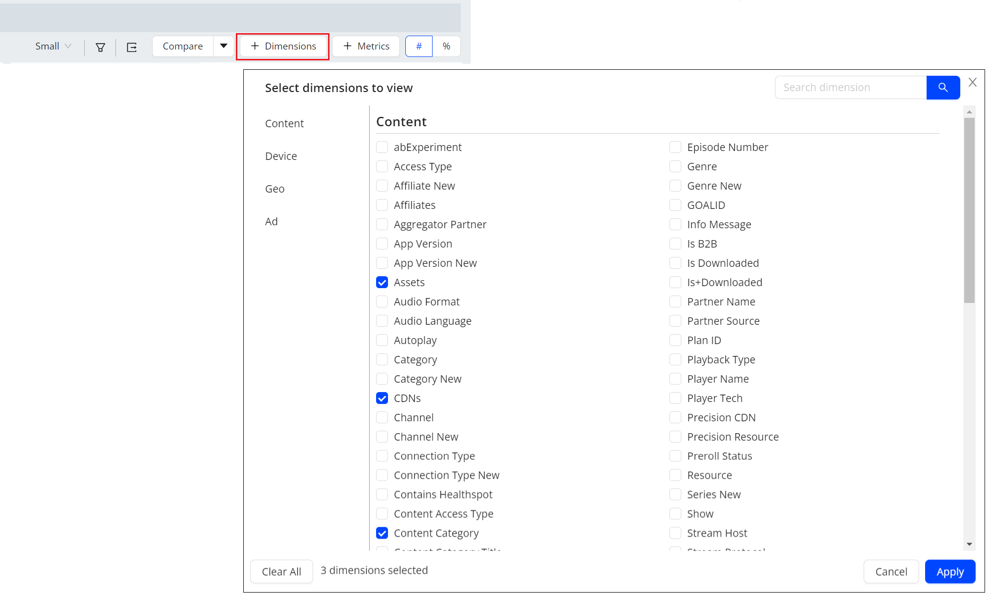 Adds support for multiple data sources in Custom dashboards to enhance analysis across your video streams, ads, and application performance.