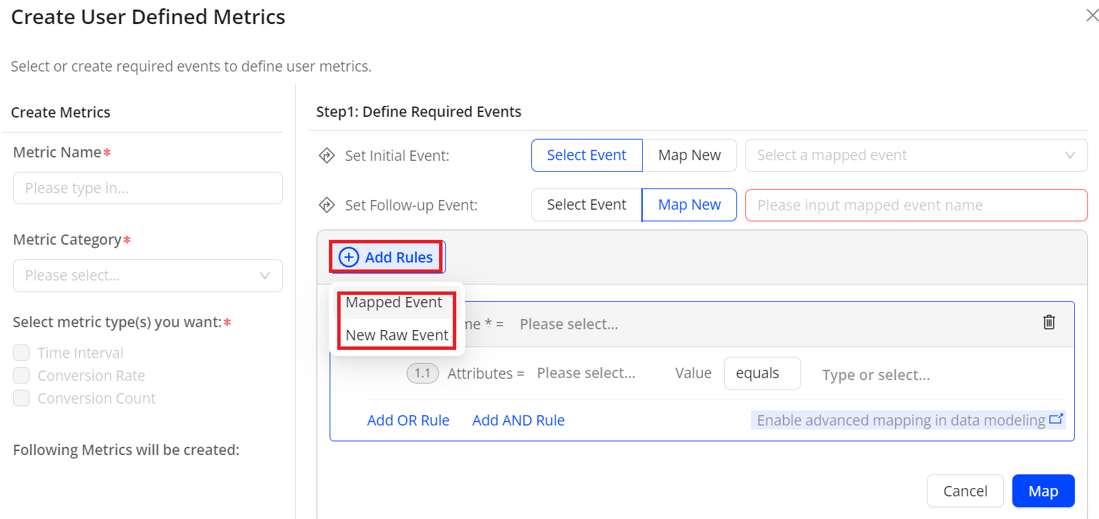 Adds the Add Rules list in the Create User Defined Metrics window to enable you to create mapping rules directly or use the rules from existing mapped events.