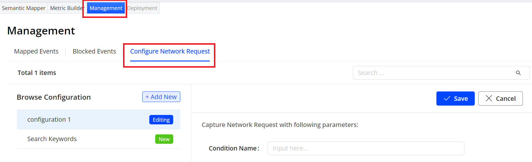 Adds Configure Network Request tab in Semantic Mapper of the Data Modeling dashboard providing access to set collection rules and check the created rules.