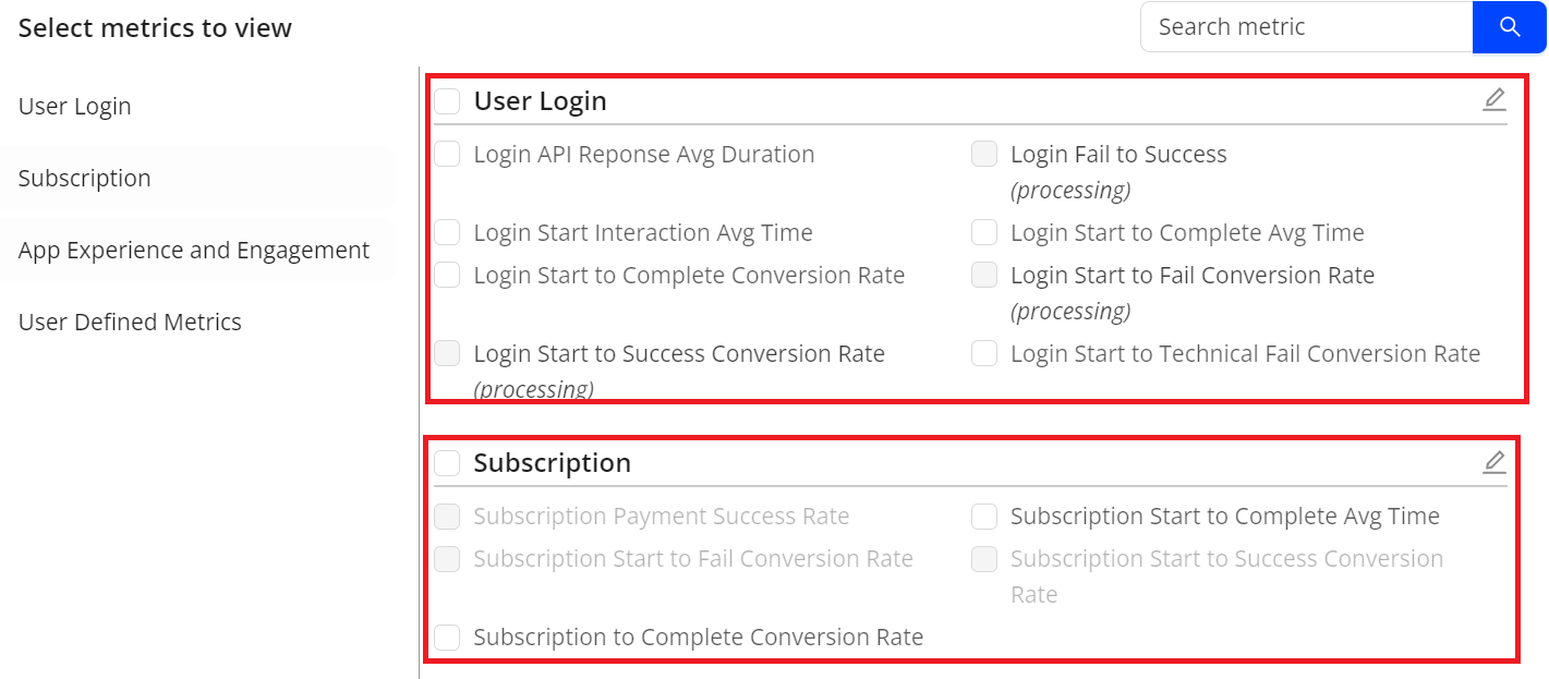 Edit icons in the Select metrics to view window for User Login and Subscription metrics, providing access to the Activate Metrics window.