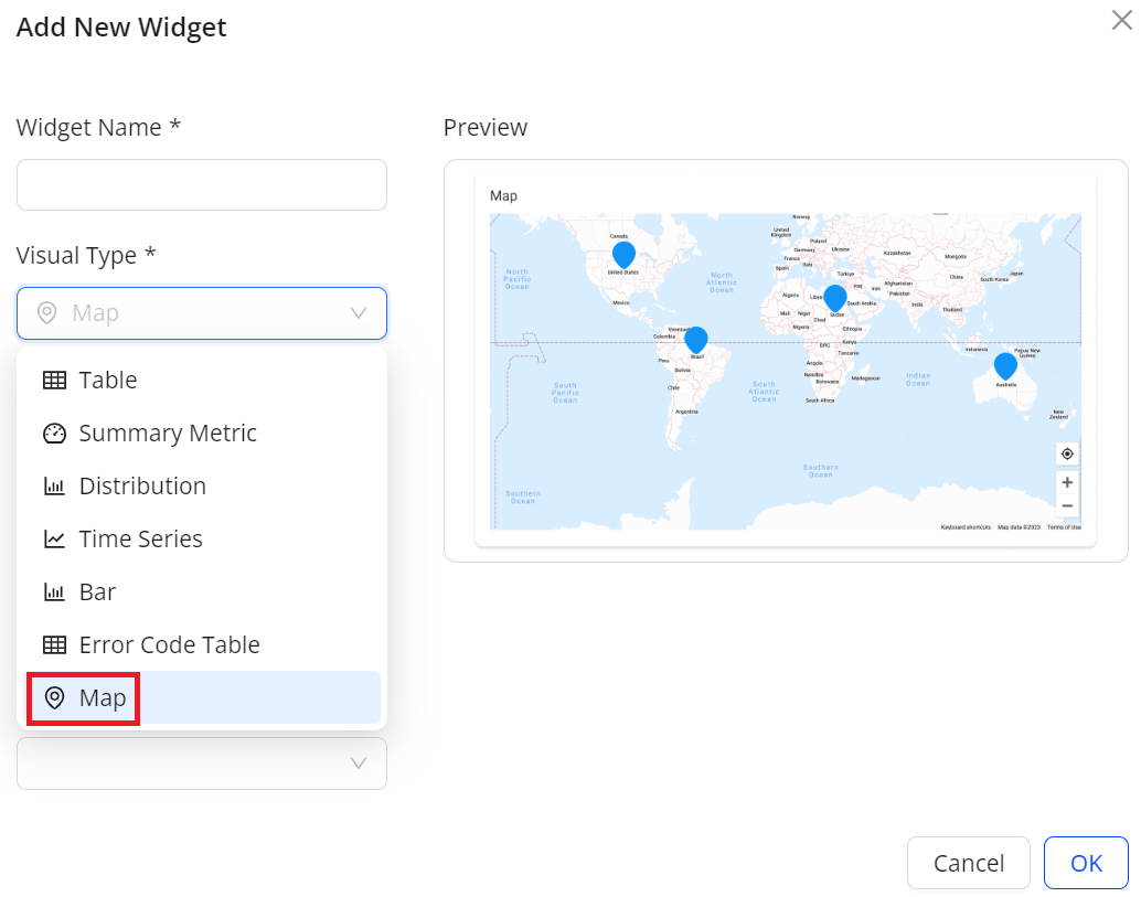 Adds Map to the Visual Type drop-down list when setting up a new widget to enable an intuitive way to check metrics from geographical perspectives.