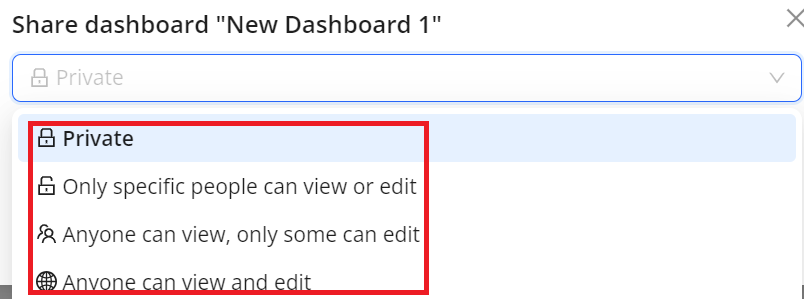 Adds a drop-down list for selecting preset options on the pop-up window after clicking Share for assigning edit or view permissions to individual users.