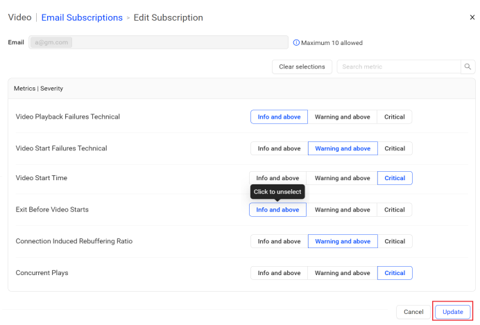 AI Alert Email Subscriptions allows the Admins to subscribe and unsubscribe user email addresses, and set specific metric notifications by severity level for each user.