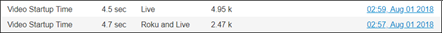 AI alerts that fire within several minutes of each other for the same metric are possibly related to the same root cause. As an alert condition progresses, the AI alert system performs continuous fault isolation and root cause analysis to detect if the initial dimensions have converged to further isolate the source of the alert. In the example below, after the initial Video Startup Time AI alert fired on August 1st at 02:57 with the root cause dimensions of Roku and Live, another Video Startup Time AI alert fired two minutes later at 02:59 with more impacted unique devices, as the root cause dimension converged to only Live traffic. This convergence indicates that within several minutes the AI alert system determined that the initial Video Startup Time alert that was not limited to Roku players and Live traffic, but was isolated to all players with Live traffic.