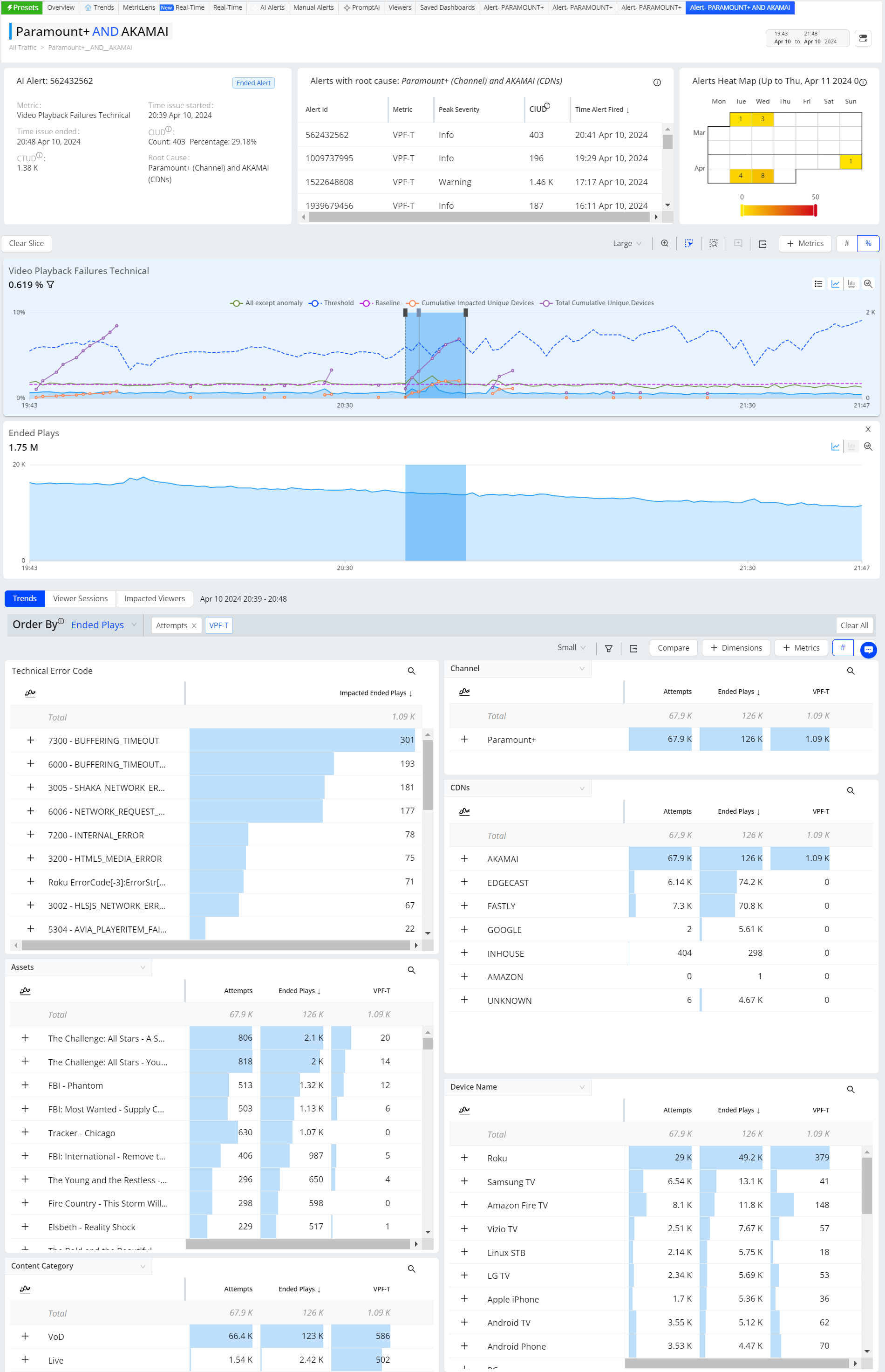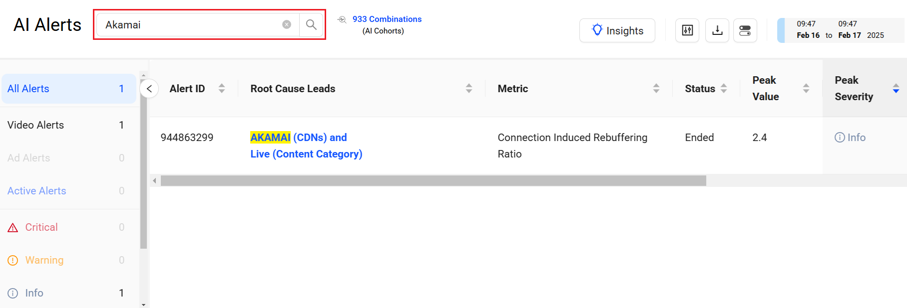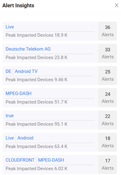 AI Alerts fired for the regional ISP and city dimensions improve your ability to diagnose root cause analysis, for example tracing the root cause to a specific regional ISP and city rather than only the DMA group. As a result, you can see alerts associated with root causes from city only; regional ISP only; regional ISP and city; CDN and regional ISP; and CDN, regional ISP, and city. The DMA group dimension is no longer supported.