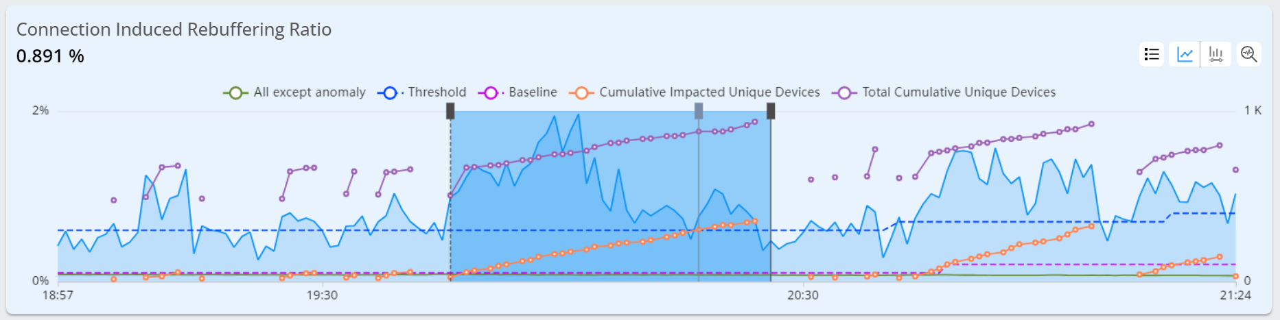 Note: AI Alerts with a root cause of "Assets" display 0 as the baseline and threshold in the UI, using a static backend threshold. These settings reflect the static aspect across asset viewer levels. Contact Conviva Support to modify these settings for specific AI Alert conditions.