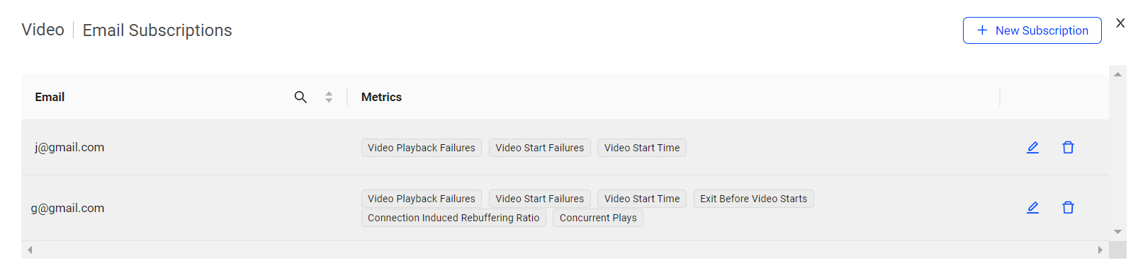The AI Alerts Email Subscription page appears with a list of the configured email subscriptions along with the configured metrics.