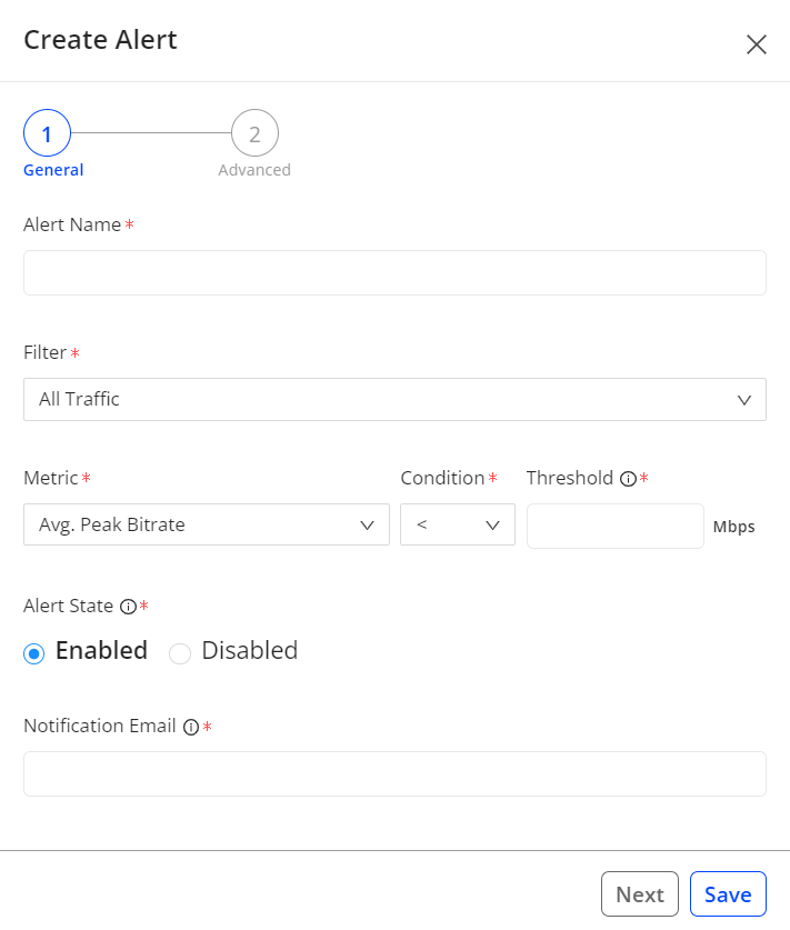 Click Save to save the current alert settings. Click Next to display the advanced alert setting options.