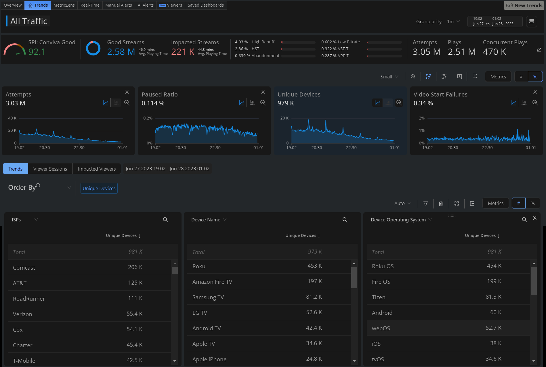 | Device Performance | This dashboard helps you understand the selected device performance by monitoring metrics such as Streaming Performance Index, Video Start Failures Technical, Exit Before Video Start, High Rebuffering, High Startup Time, Video Playback Failures Technical, Low Bitrate, Video Start Time, Connection Induced Rebuffering Ratio, and Bitrate. |