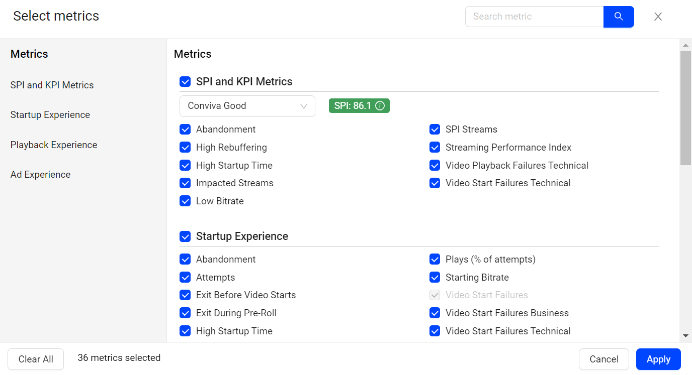 Conviva formulates a unified streaming performance KPI based on the percentage of streaming sessions with good or best viewing experience. This KPI represents the Conviva Streaming Performance Index, and is based on the percentage of streams with: