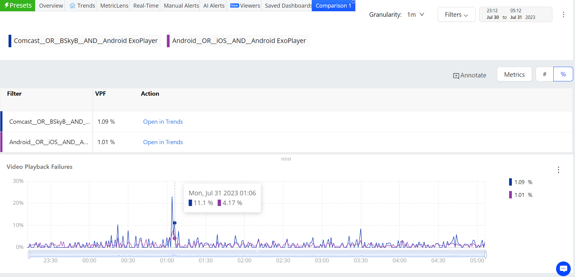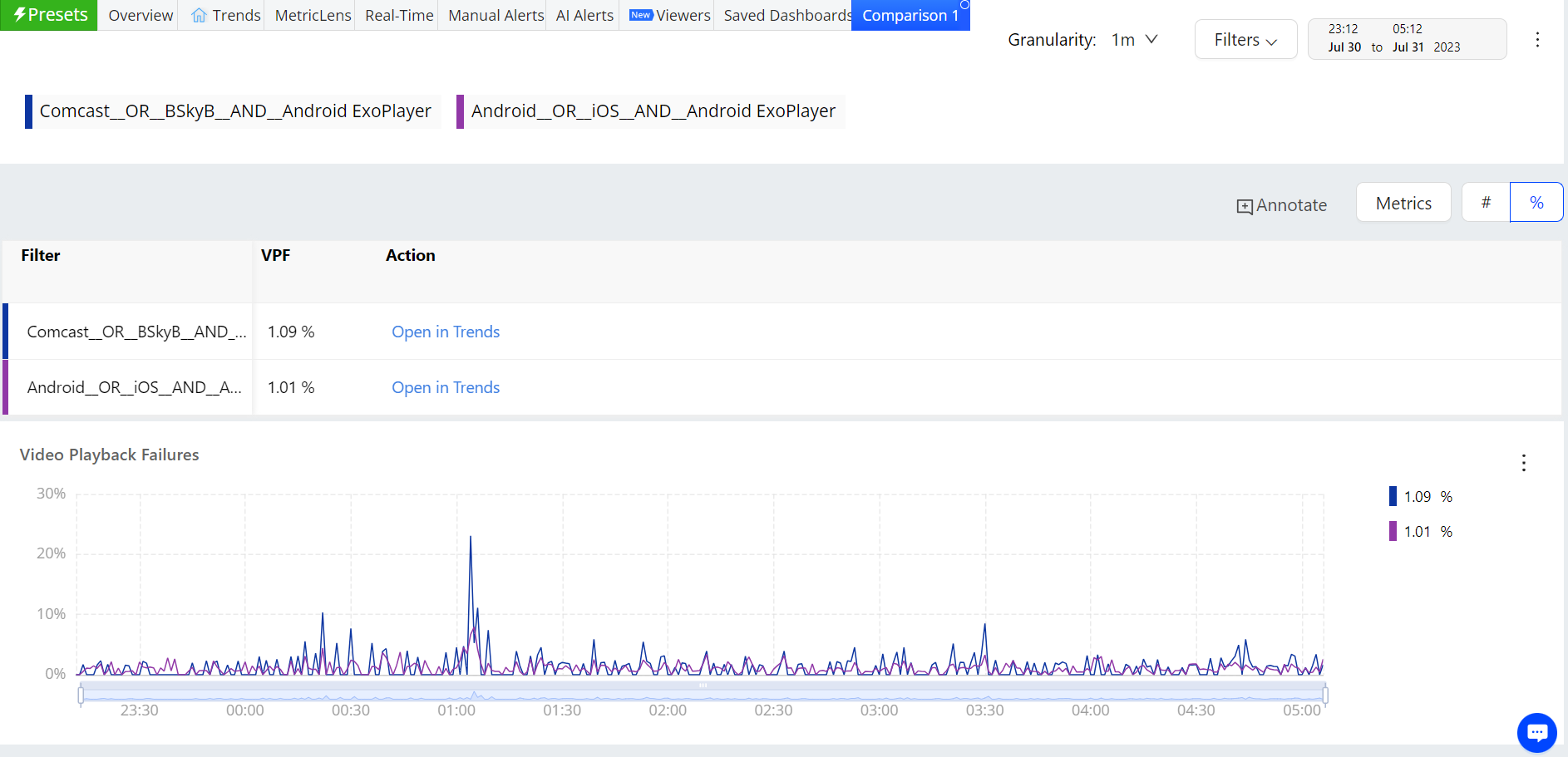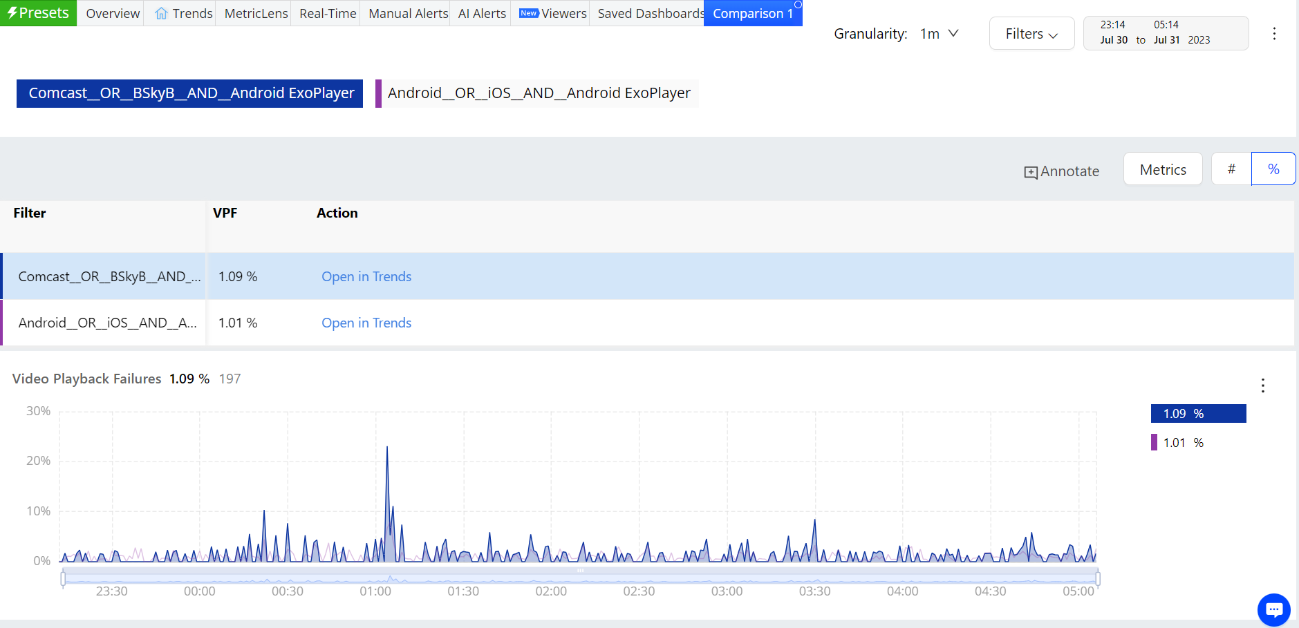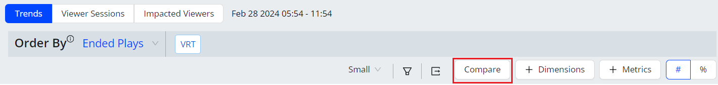 Time Series comparisons enable you to select metrics and dimension values for comparative analysis in a separate dashboard. Because the metric and dimension values are determined by the current filter settings, make sure the current filter settings, such as All Traffic, Live, or VOD, represent the data set that intended for time series comparisons.