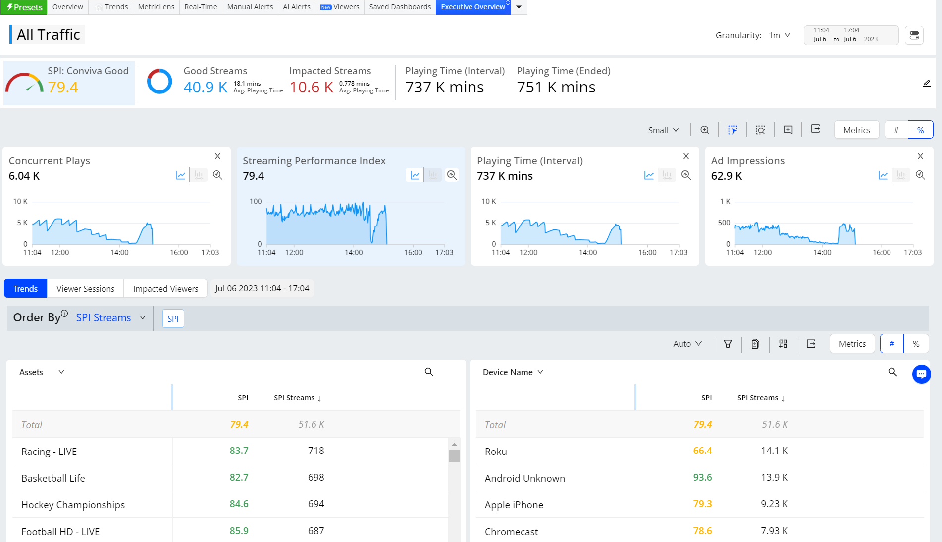 | Executive Overview | This dashboard enables you to track SPIs by monitoring metrics such as Concurrent Plays, SPI, Playing Time, and Ad Impressions. |