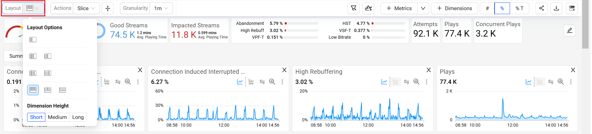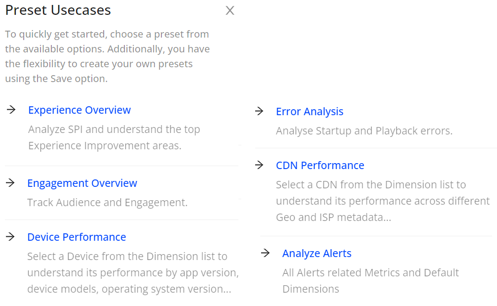 | Experience Overview | This dashboard enables you to analyze the SPIs to identify the anomalies and understand the top experience improvement areas by monitoring metrics such as Concurrent Plays, SPI, Video Start Failures Technical, Exit Before Video Start, High Rebuffering, High Startup Time, Video Playback Failures Technical, and Low Bitrate. |