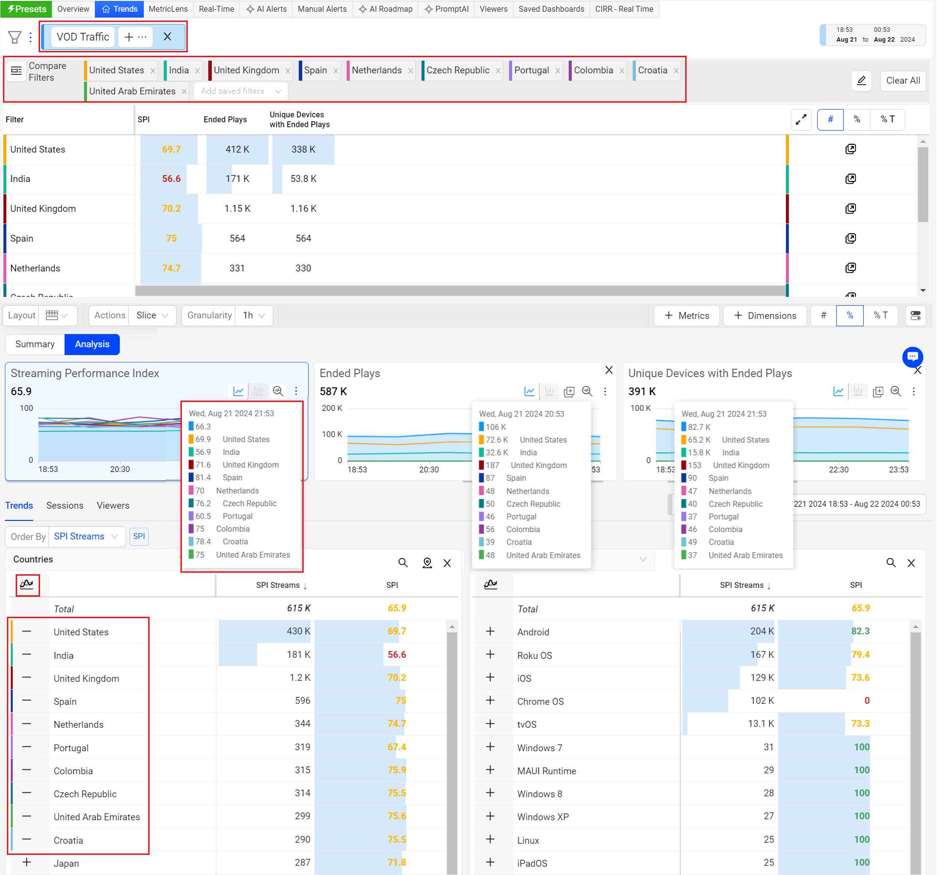 Along with metrics and metadata, VSI provides a streaming performance index to help you quickly identify performance issues across dimensions, such as player, asset, and country.