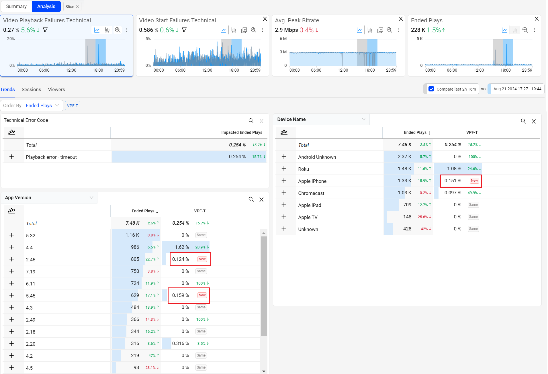 | Error Analysis | This dashboard helps you analyze startup and playback errors by monitoring metrics such as Attempts, (Selected) Video Start Failures Technical , Video Start Failures Business, Ended Plays, Video Playback Failures Technical, and Video Playback Failures Business. |