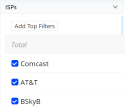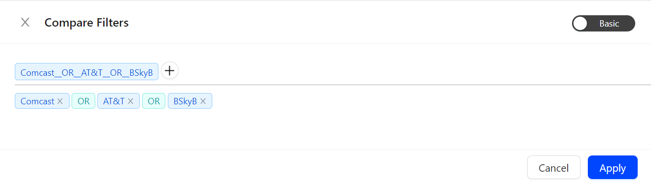 Click the dimension values to apply filters to the data. There are several ways to build and customize filters for comparisons. Up to 20 filters can be applied: