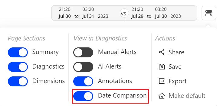 From the toggle icon, switch on the toggle next to Date Comparison to the display of comparison metrics based on the selected compare time period.