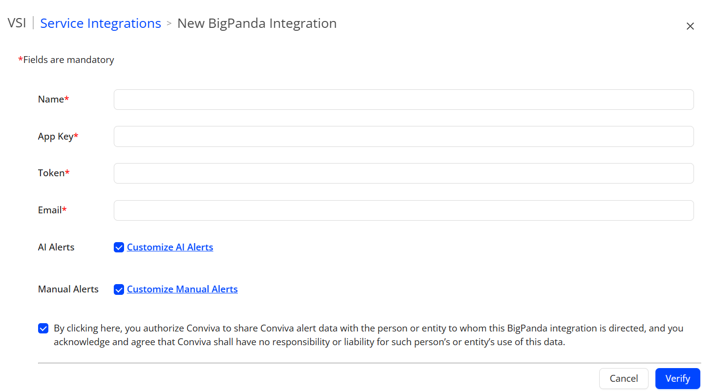 In Conviva VSI, go to Settings > Service Integrations. Click BigPanda.