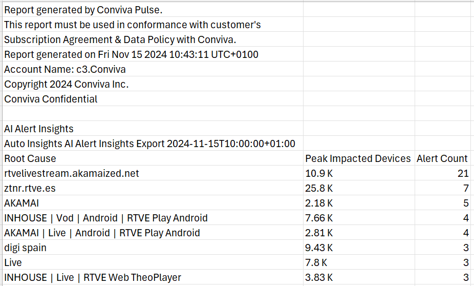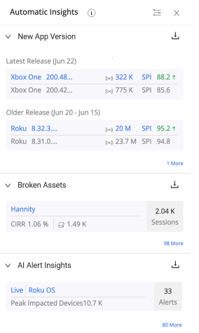 Automatic Insights highlight areas with the most meaningful impacts throughout the video ecosystem, such as recurring AI alert root cause groups, broken assets, and new application versions to help streamline root cause analysis and uncover underlying performance issues.