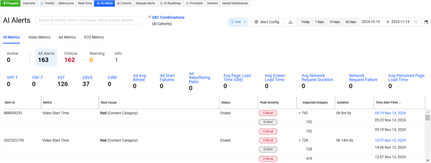 Click Vod to launch the AI Alerts page with alerts filtered to show only the recent Vod-related AI alerts.