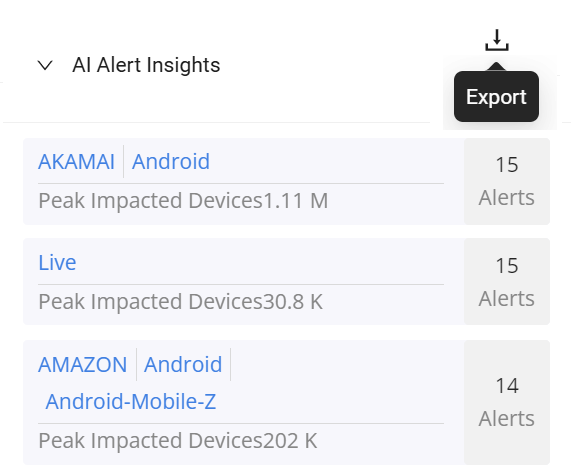 The export button downloads all listed AI alert insight(s) in a .csv file.